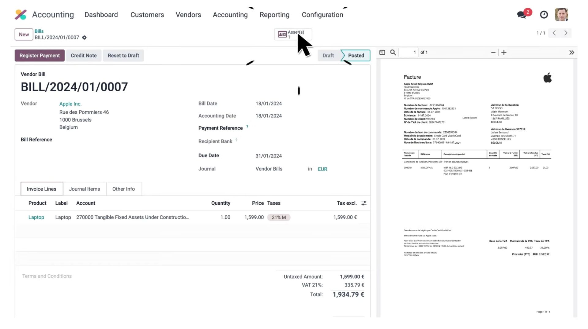 Eliminate manual data input with intelligent automation. Odoo Accounting leverages advanced AI to capture and process invoice data with up to 98% accuracy—allowing your team to simply review and validate. Streamline financial workflows, reduce errors, and accelerate accounting operations with a smarter, fully automated system.